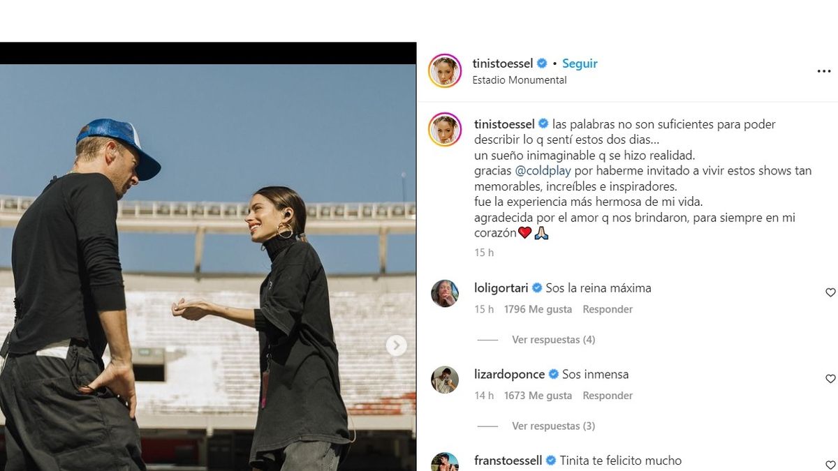 "Las palabras no son suficientes para poder describir lo q sentí estos dos días… Un sueño inimaginable que se hizo realidad. Gracias @coldplay por haberme invitado a vivir estos shows tan memorables, increíbles e inspiradores. Fue la experiencia más hermosa de mi vida. Agradecida por el amor que nos brindaron, para siempre en mi corazón", reflejó Tini Stoessel muy emocionada en Instagram, quien se encontró allí de casualidad en el mismo lugar con Camila Homs, ex de Rodrigo de Paul.