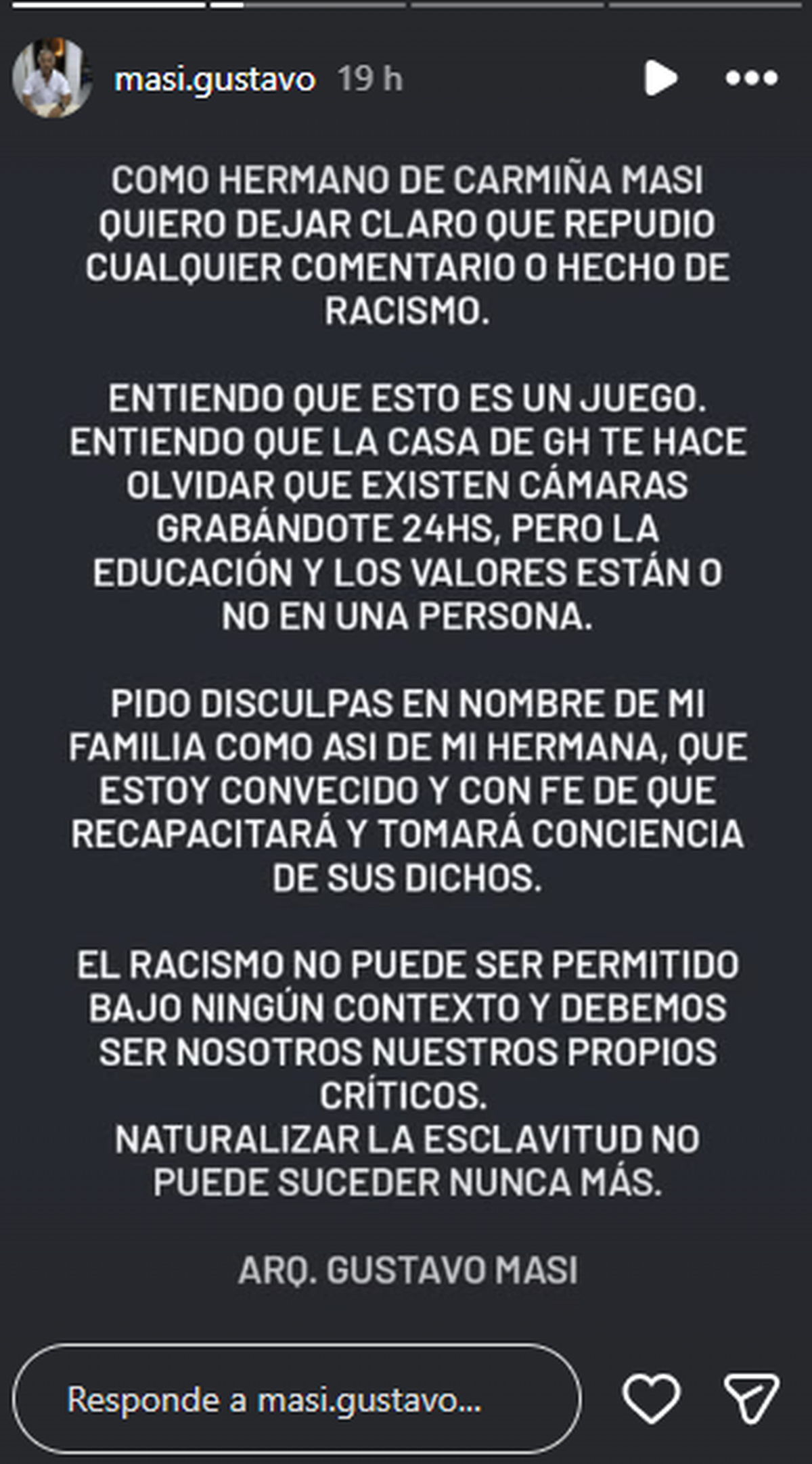 "Como hermano de Carmiña Masi, quiero dejar claro que repudio cualquier comentario o hecho de racismo".