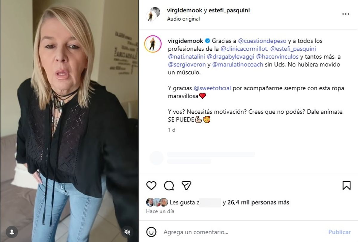 En el mismo posteo, la ex GH aprovechó para agradecer a todo el equipo de la clínica Cormillot que la acompañó en este proceso. Entre los comentarios, se destacó el mensaje de Estefanía Pasquini, quien le dedicó unas palabras de reconocimiento: “Felicitaciones, Vir. Esto es todo mérito tuyo. Nosotros damos herramientas, pero está en vos aplicarlas o no, y vos te agarraste de todo y acá tus logros, muy merecidos”.