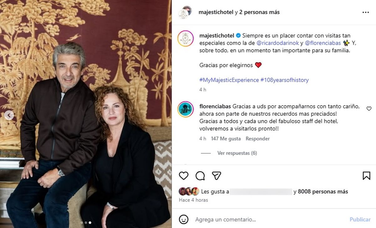 Desde la cuenta oficial del hotel replicaron las fotos y les dedicaron un mensaje especial: “Siempre es un placer contar con visitas tan especiales como la de @ricardodarinok y @florenciabas. Y, sobre todo, en un momento tan importante para su familia”. El guiño dejó en evidencia que el viaje no era uno más, sino que estaba directamente vinculado con este presente familiar tan significativo.