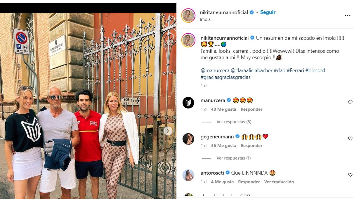"¡Un resumen de mi sábado en Imola! Familia, looks, carrera, podio. ¡Wowww! Días intensos como me gustan a mí. ¡Muy escorpio! Gracias, gracias, gracias", expresó Nicole Neumann feliz en Instagram.