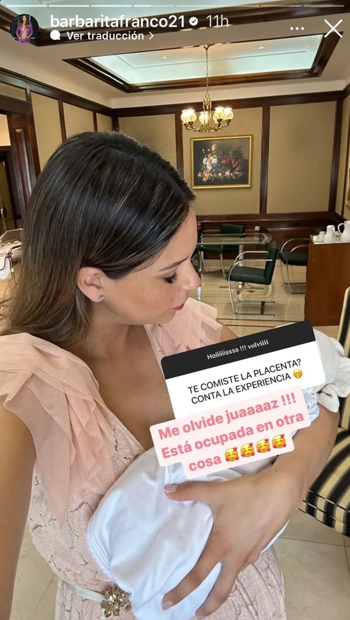 Aprovechando algún ratito en el que Saritah probablemente descansaba, Barby Franco retomó su actividad en las redes sociales. "Holiiiiissss!!! volviiii", escribió sobre una foto que se tomó junto a su pareja en el baño de su cuarto en el sanatorio "Antes de parir", desde una historia de Instagram.