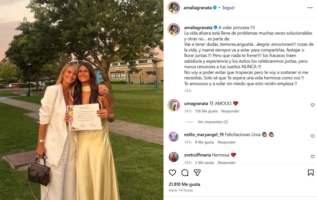 “Pero que nada te frene. Los fracasos traen sabiduría y experiencia, y los éxitos los celebraremos juntas, pero nunca renuncies a tus sueños. Nunca. No voy a poder evitar que tropieces, pero te voy a sostener si me necesitás. Solo sé que te espera una vida hermosa como vos. Te amo, y a volar sin miedo que esto recién empieza”, finalizó.