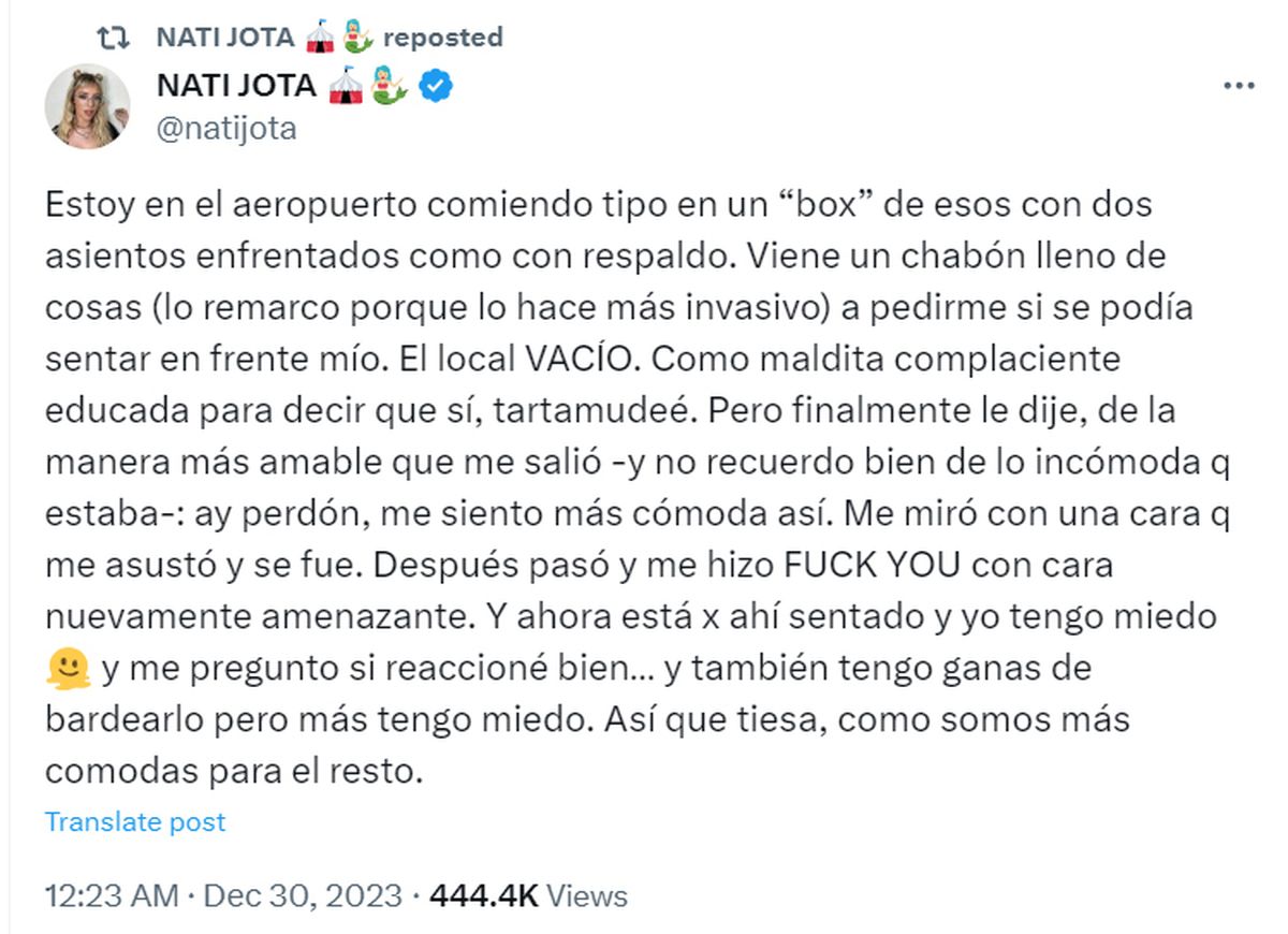 A través de su cuenta de X, la periodista escribió: “Estoy en el aeropuerto comiendo tipo en un ‘box’, de esos con dos asientos enfrentados como con respaldo. Viene un chabón lleno de cosas (lo remarco porque lo hace más invasivo) a pedirme si se podía sentar enfrente mío. El local estaba vacío”.