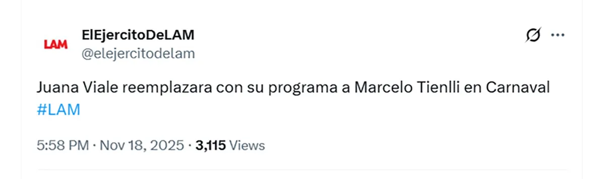 Mientras tanto, la incógnita sobre quién tomaría la posta fue despejada por El Ejército de LAM. A través de X, confirmaron: "Juana Viale reemplazará con su programa a Marcelo Tinelli en Carnaval". De esta manera, la actriz y conductora será quien ocupe el horario del programa de Tinelli, Estamos de paso, con su propio ciclo.