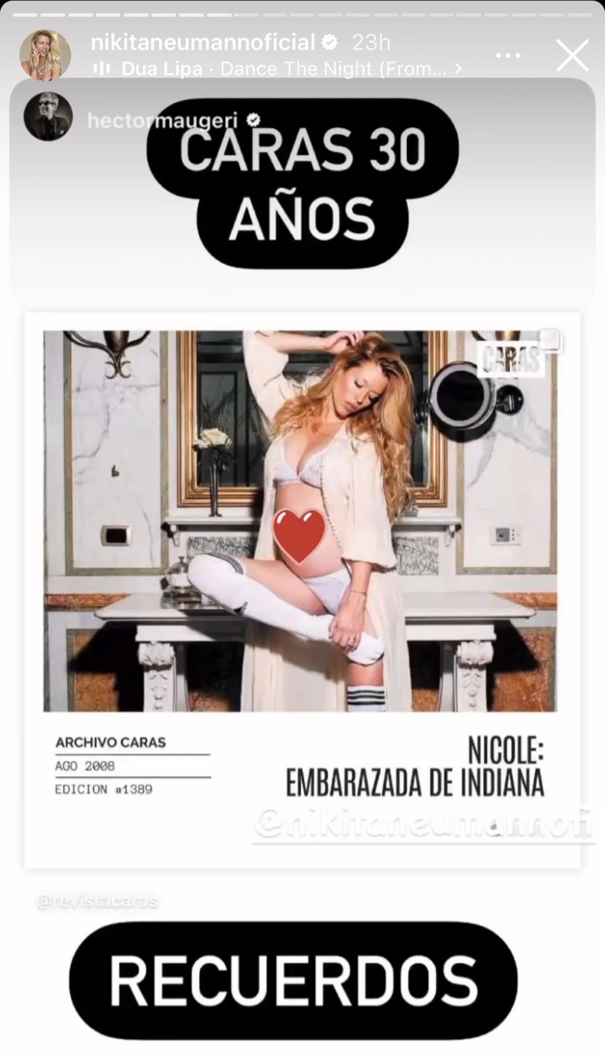 "Recuerdos", escribió ella en sus historias de Instagram junto a una tapa de revista Caras del año 2009 y en la cual se leia: "Nicole embarazada de Indiana".