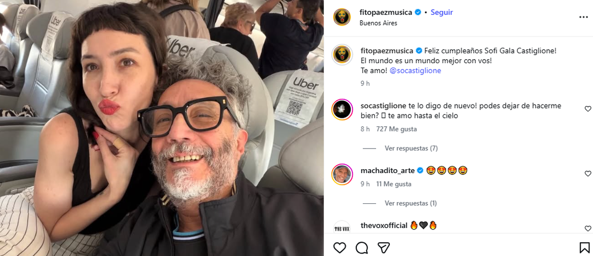 "Feliz cumpleaños Sofi Gala Castiglione. El mundo es un mundo mejor con vos. Te amo", escribió el músico en su cuenta de Instagram. El mensaje, lejos de sonar como un simple saludo protocolar, despertó todo tipo de interpretaciones. Gala tomó la palabra y retrucó: " Te lo digo de nuevo: ¿podes dejar de hacerme bien? Te amo hasta el cielo".