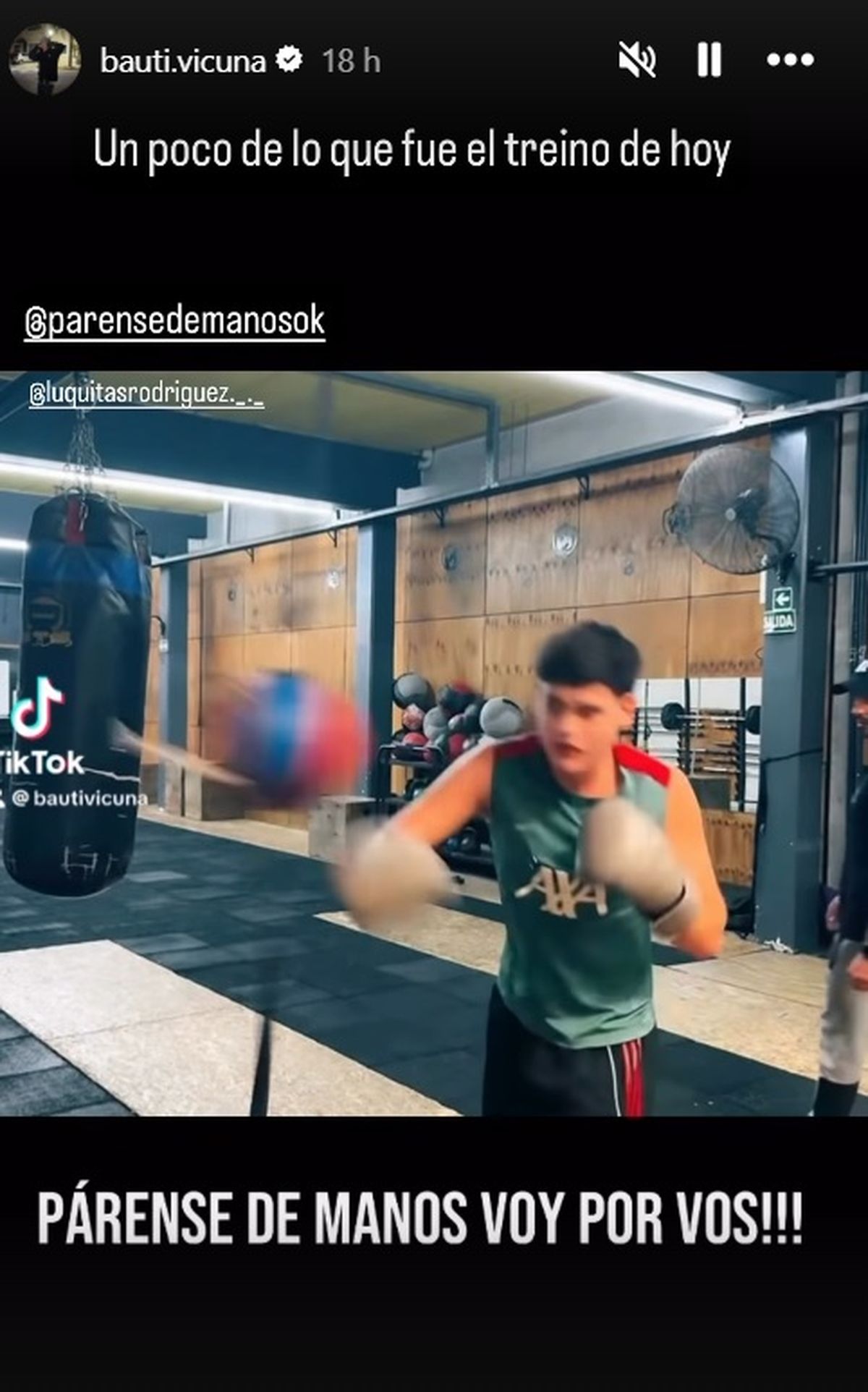 "Un poco de lo que fue el treino de hoy. Párense de manos voy por vos!", indicó con euforia el joven y dejando en claro su deseo de participar en el evento de boxeo amateur etiquetando a su organizador Luquitas Rodríguez donde suelen participar muchos famosos e influencers.