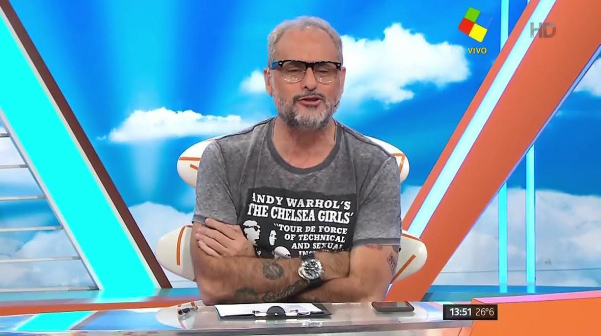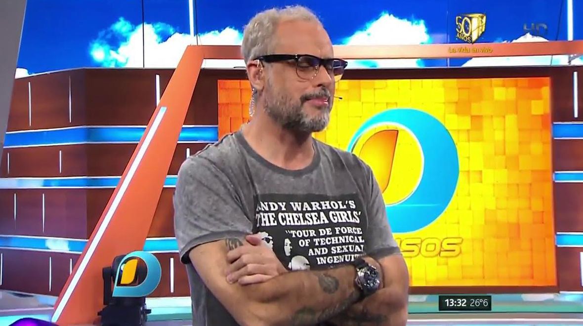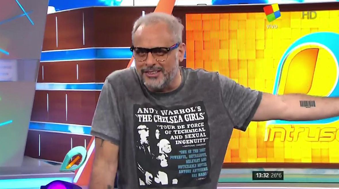 En su reincorporación a "Intrusos", el animador mostró un look renovado. Además de su ya conocido color de pelo blanco, se puso una remera gris oscura de Andy Warhol, unos jeans negros, unos modernos anteojos y un cinturón a la vista.