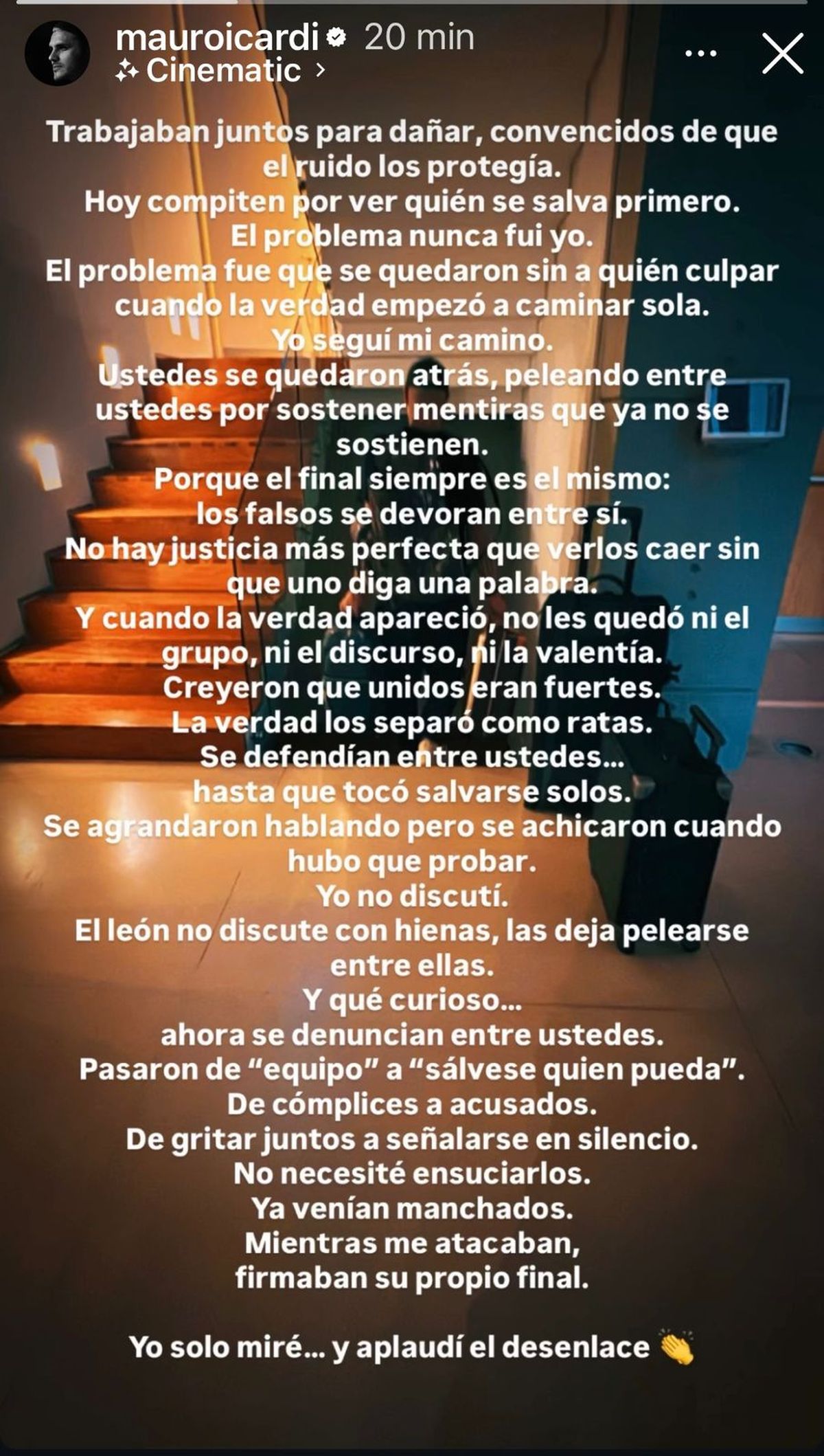 Y lejos de concluir su catarsis contenida durante tantos meses de angustia frente a todas las acusaciones que intentaron hacer en su contra, Mauro Icardi arremetió: "Creyeron que unidos eran fuertes. La verdad los separó como ratas.Se defendían entre ustedes... hasta que tocó salvarse solos. Se agrandaron hablando pero se achicaron cuando hubo que probar".