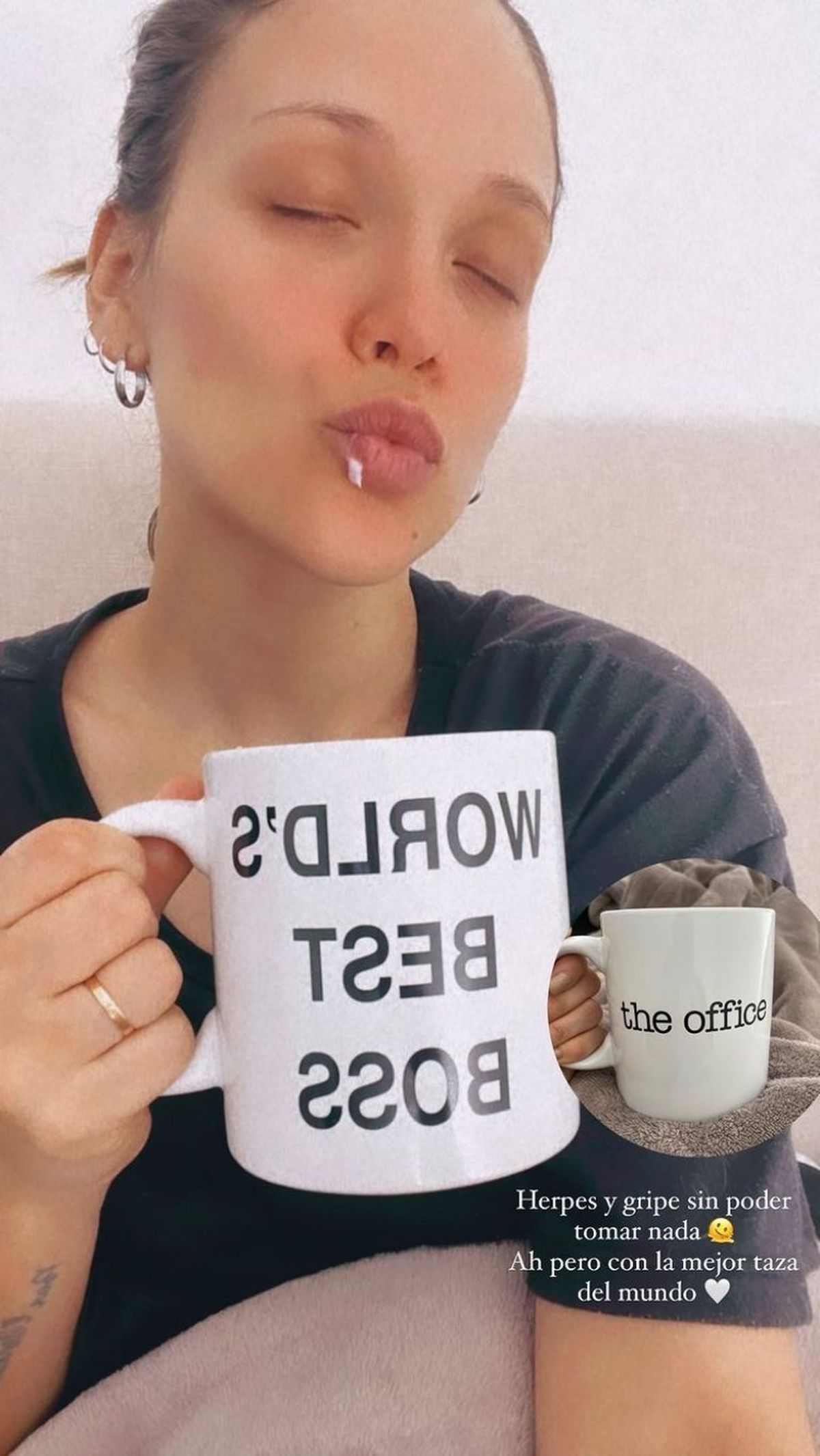 "Herpes y gripe sin poder tomar nada. Ah, pero con la mejor taza del mundo", escribió Barbie Vélez con una una foto en la que se la ve con el labio un poco hinchado y con una crema para curar la infección, mientras toma algo en su original taza de la serie The Office.