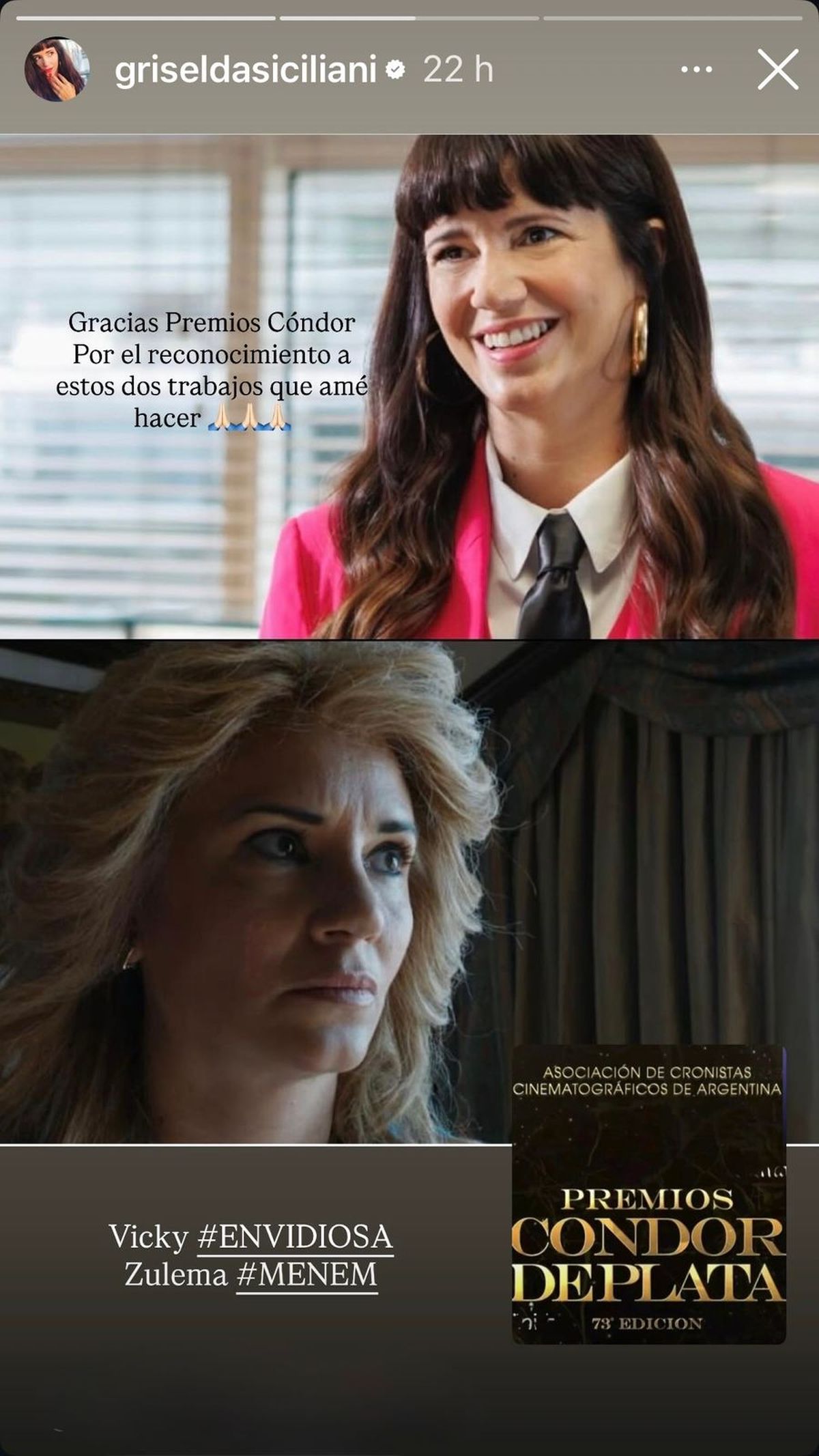Junto a las imágenes promocionales de las ficciones y los logos de los Premios Cóndor de Plata y de la Asociación de Cronistas Cinematográficos de Argentina —cuya ceremonia está prevista para abril de 2026—, la actriz escribió un mensaje de agradecimiento: “Gracias Premios Cóndor por el reconocimiento a estos dos trabajos que amé hacer”.