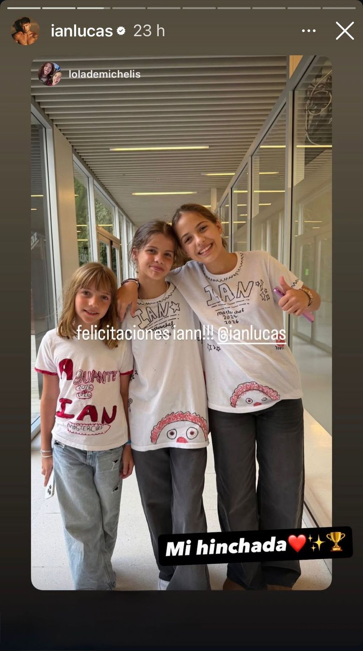 Con remeras estampadas especialmente con la inscripción "Aguante Ian, MasterChef 2025/2026", Lola posó junto a sus amiguitas Francesca e Isabella Icardi -nada menos que las hijas de Wanda Nara- y sobre la postal le sumó el mensaje "¡Felicitaciones Iann!!!" arrobando al destinatario, en una clara demostración de confianza.