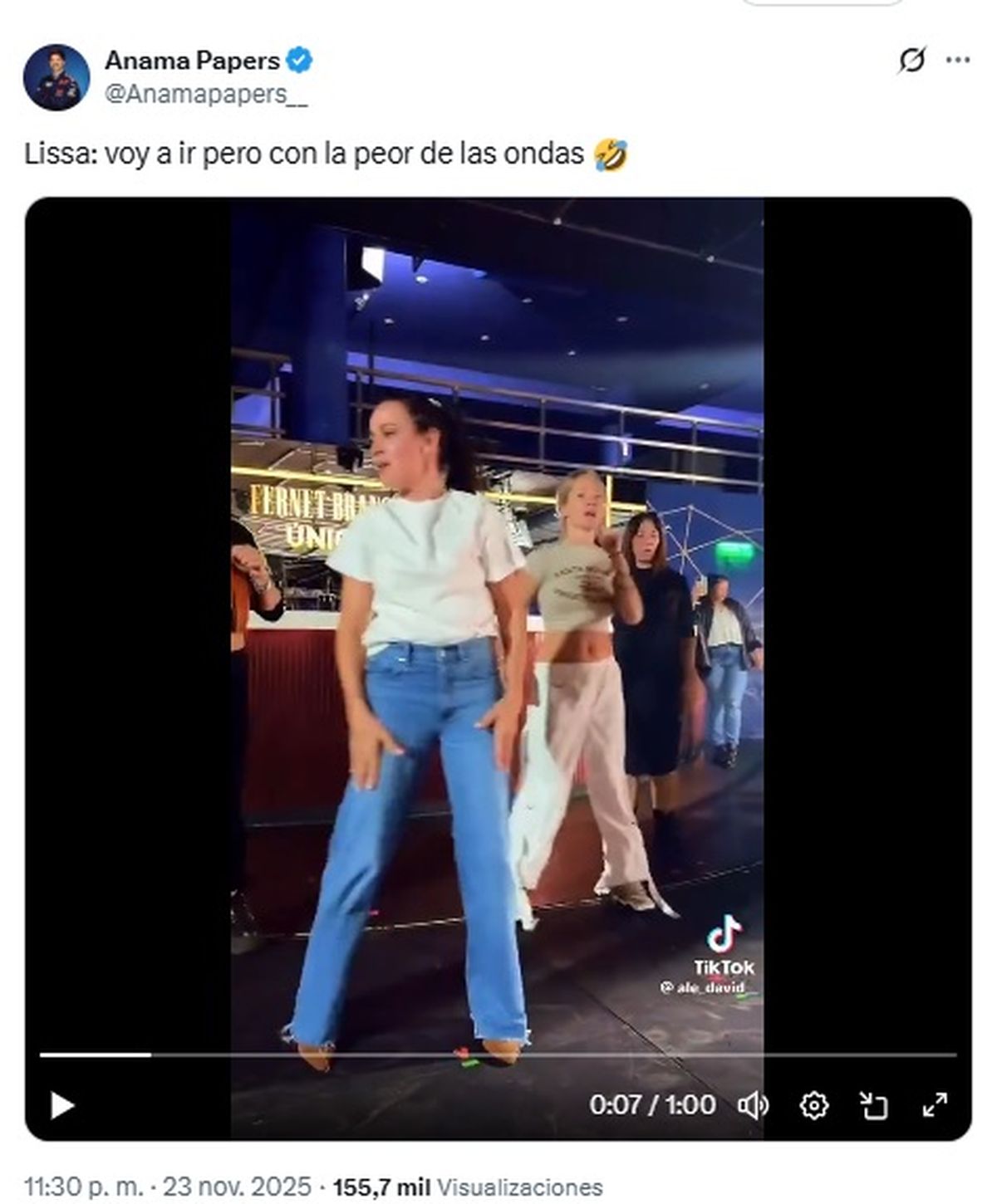 “Lissa: voy a ir con la peor de las ondas”, escribió el usuario @Anamapapers_ desde su cuenta de X (ex Twitter) junto a las imágenes en las que el grupo surgido del reality PopStars practica una de las coreografías ya en el boliche del show y puede verse a Lissa ensayando con una visible poca voluntad.