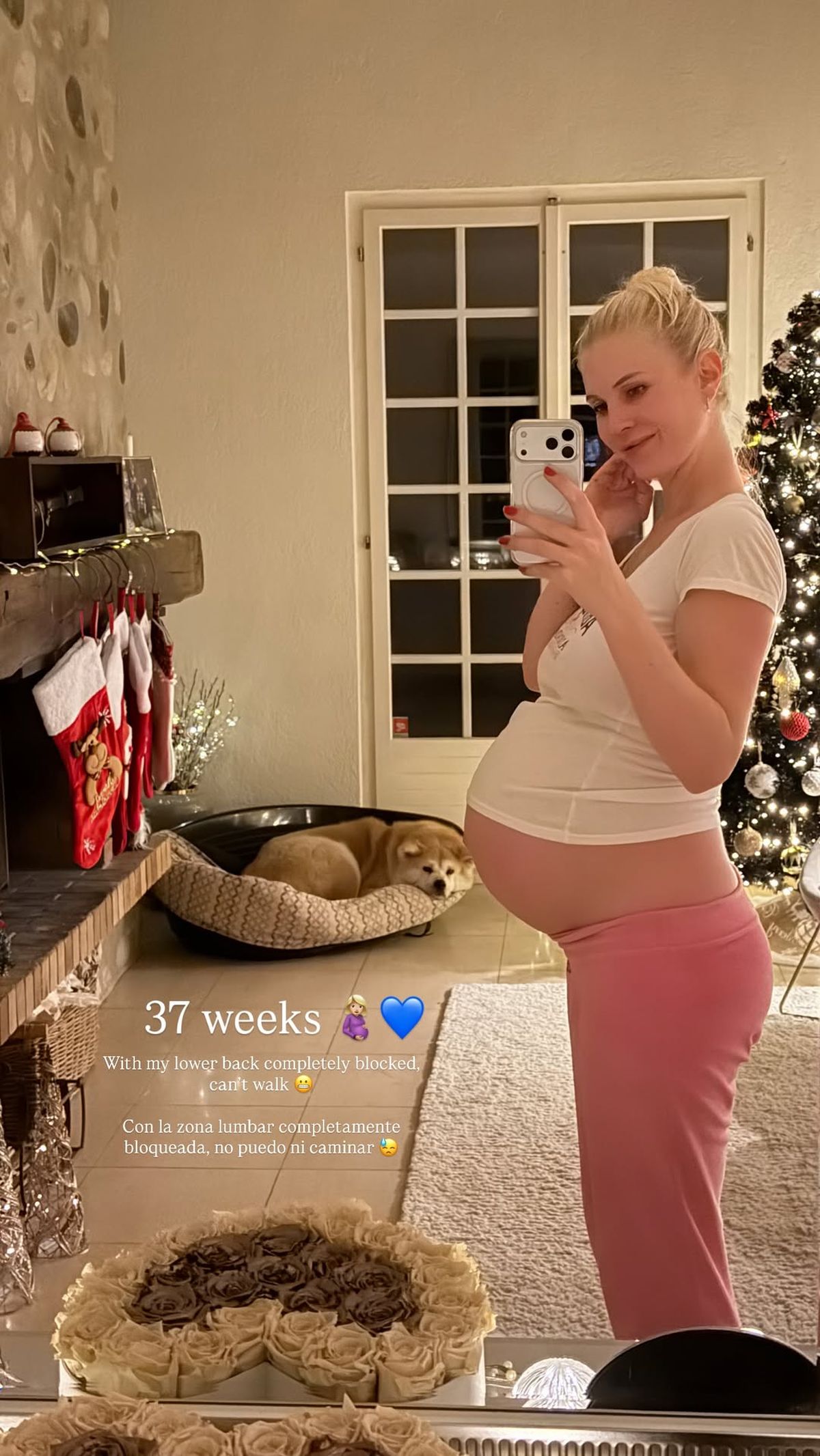 A través de sus historias de Instagram, compartió cómo se siente en esta etapa y describió las molestias físicas que enfrenta. "37 semanas. Con la zona lumbar completamente bloqueada no puedo ni caminar”, escribió sobre una selfie de ella.