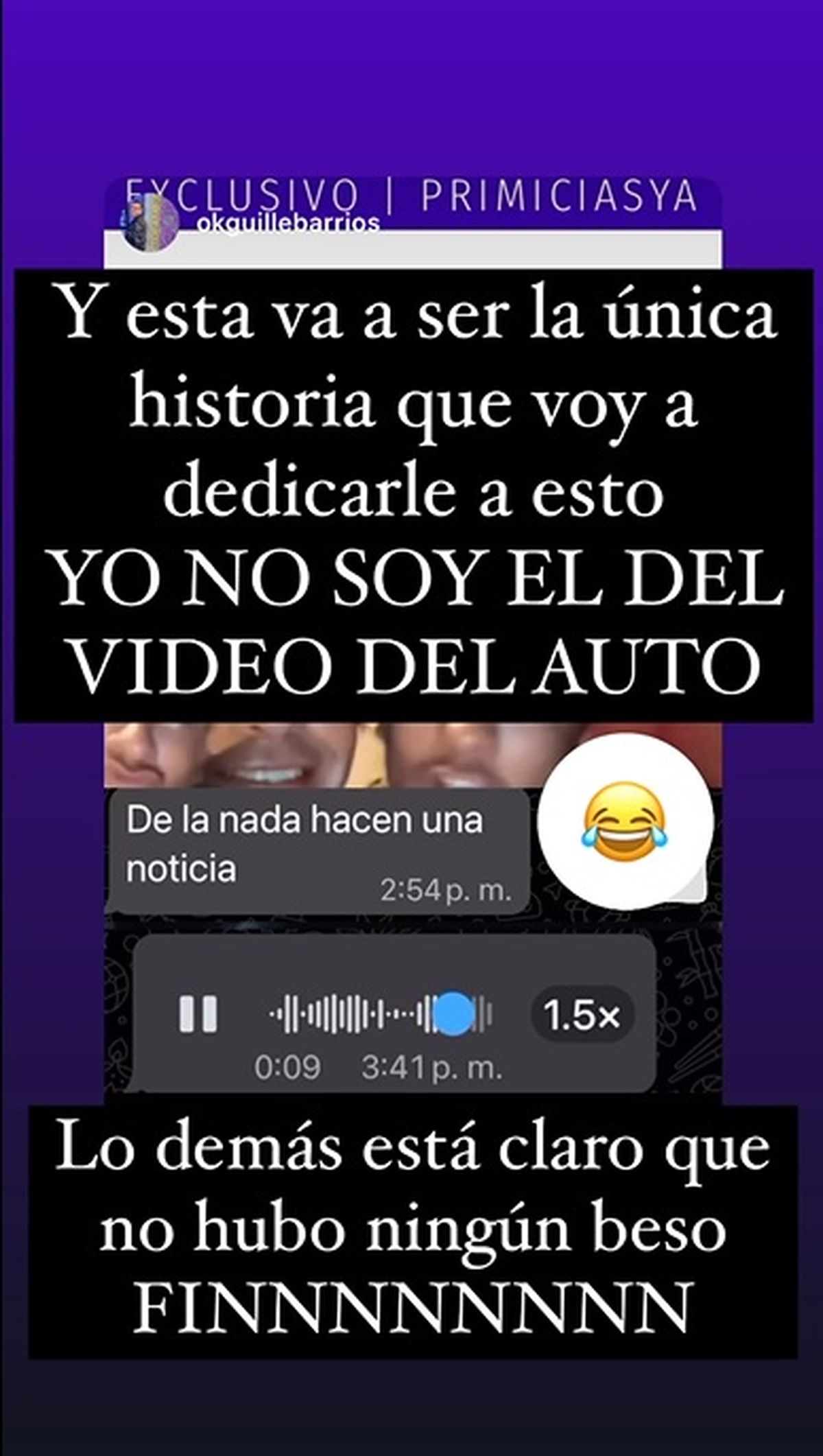 “Esta va a ser la única historia que voy a dedicarle a esto. Yo no soy el del video del auto. Lo demás está claro que no hubo ningún beso. Fin”, escribió el militar en sus Instagram Stories junto al audio en el que le niega la versión al periodista Guillermo Barrios.