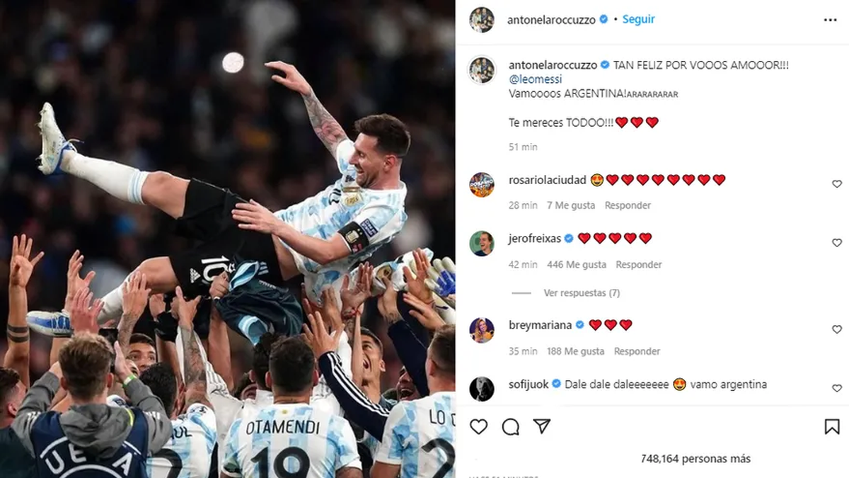 “Tan feliz por vos, amor. Vamos Argentina. Te mereces todo”, fue la frase a la que le agregó emojis de dos corazones y arrasó en las redes donde cosechó casi un millón de likes.