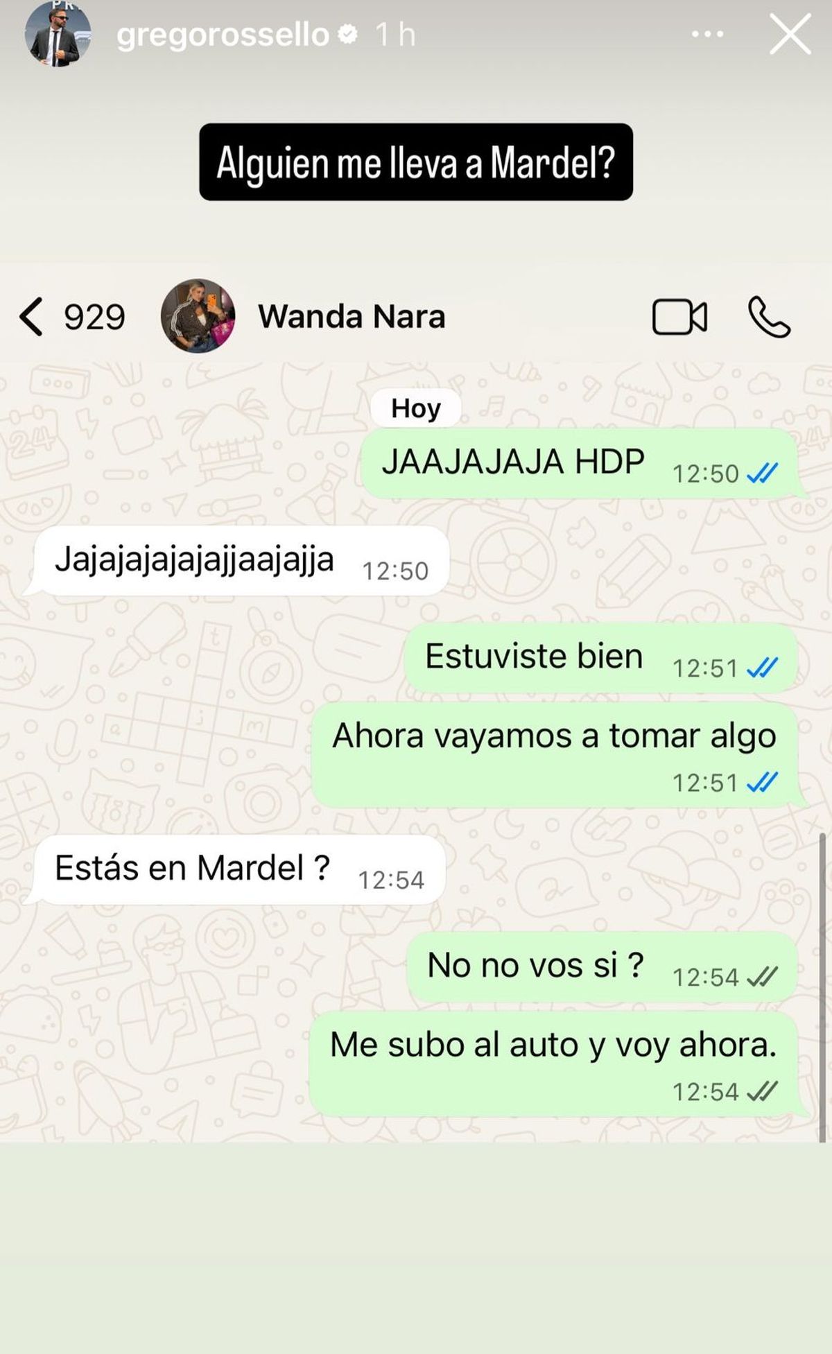Al tiempo que en una segunda Instagram Storie Grego mostró cómo continuó la conversación virtual con la mayor de las Nara. "JAJAJAJJA HDP estuviste bien", fue la respuesta del influencer haciéndole saber que ya estaba enterado de su pícara movida. Y con más risas como reacción en el chat, Wanda le preguntó directa: "¿Estás en Mardel?", a lo que Rosello respondió con astucia: "No no, ¿vos si? Me subo al auto y voy ahora".