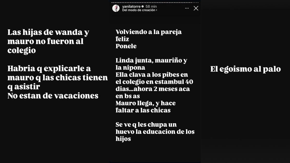 Luego, la angelita redobló la crítica con una frase breve pero tajante: “El egoísmo al palo”. Y más tarde publicó un extenso texto donde volvió a apuntar contra la pareja: “Volviendo a la pareja feliz... ponele. Linda junta, mauriño y la nipona. Ella clava a los pibes en el colegio en Estambul 40 días. Ahora 2 meses acá en Buenos Aires, Mauro llega y hace faltar a las chicas. Se ve que les chupa un huevo la educación de los hijos”.