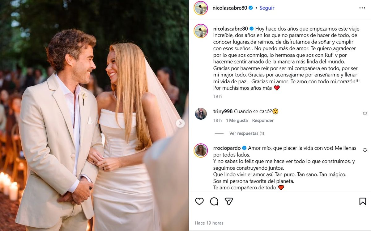 A través de un posteo con varias fotos juntos, el artista decidió poner en palabras lo que siente por su esposa. "Hoy hace dos años que empezamos este viaje increíble, dos años en los que no paramos de hacer de todo, de conocer lugares, de reírnos, de disfrutarnos de soñar y cumplir con esos sueños", comenzó su romántico posteo Nicolás Cabré.