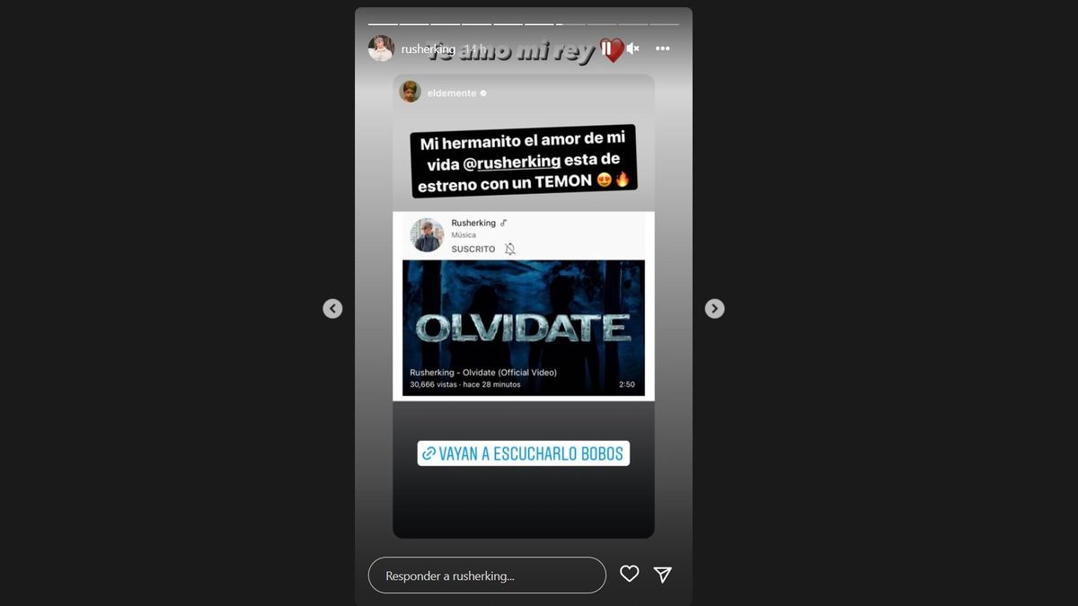 "Mi hermanito, el amor de mi vida, está de estreno con un temón. Vayan a escucharlo", publicó El Demente en sus historias. A lo que el novio de la China Suárez comentó: "Te amo, mi rey", junto al emoji de corazón.