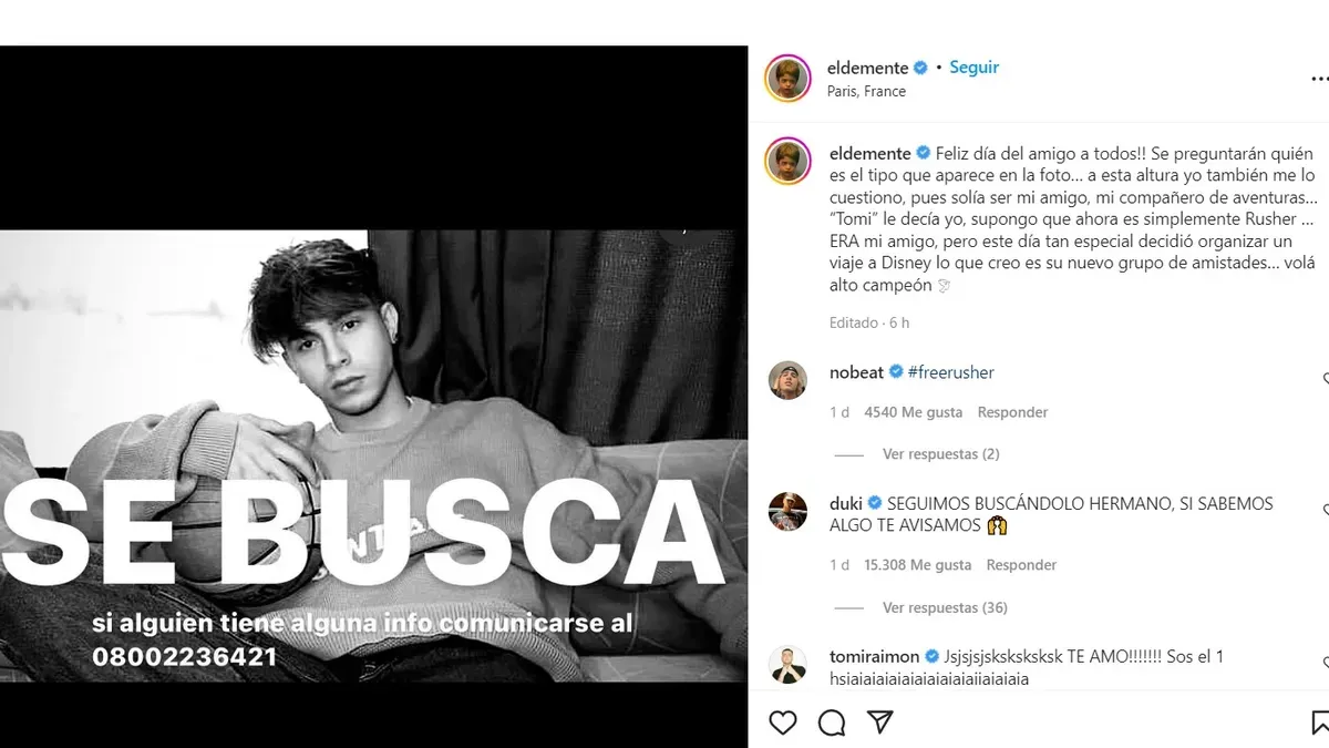 Y añadió: "Tomi le decía yo, supongo que ahora es simplemente Rusher. ERA mi amigo, pero en este día tan especial decidió organizar un viaje a Disney con el que creo que es su nuevo grupo de amigos…".
