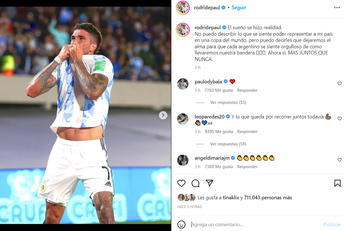 En sus redes, De Paul subió la lista de Scaloni y expresó: "El sueño se hizo realidad. No puedo describir lo que se siente poder representar a mi país en una copa del mundo, pero puedo decirles que dejaremos el alma para que cada argentino se siente orgulloso de como llevaremos nuestra bandera . Ahora sí, más juntos que nunca".