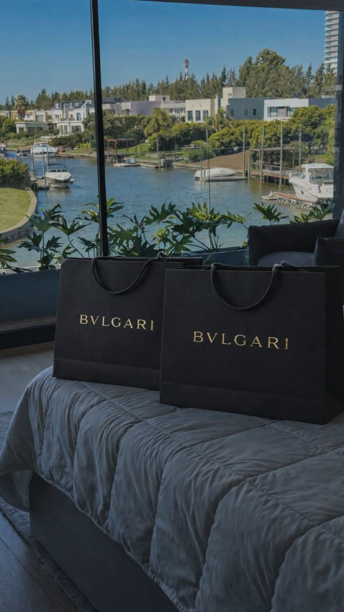 La conductora de MasterChef Celebrity compartió en sus historias de Instagram una imagen tomada en la habitación de su casa de Nordelta, con vista al lago. En la foto se aprecia parte de la cama y, en primer plano, dos bolsas de la marca de lujo Bulgari.