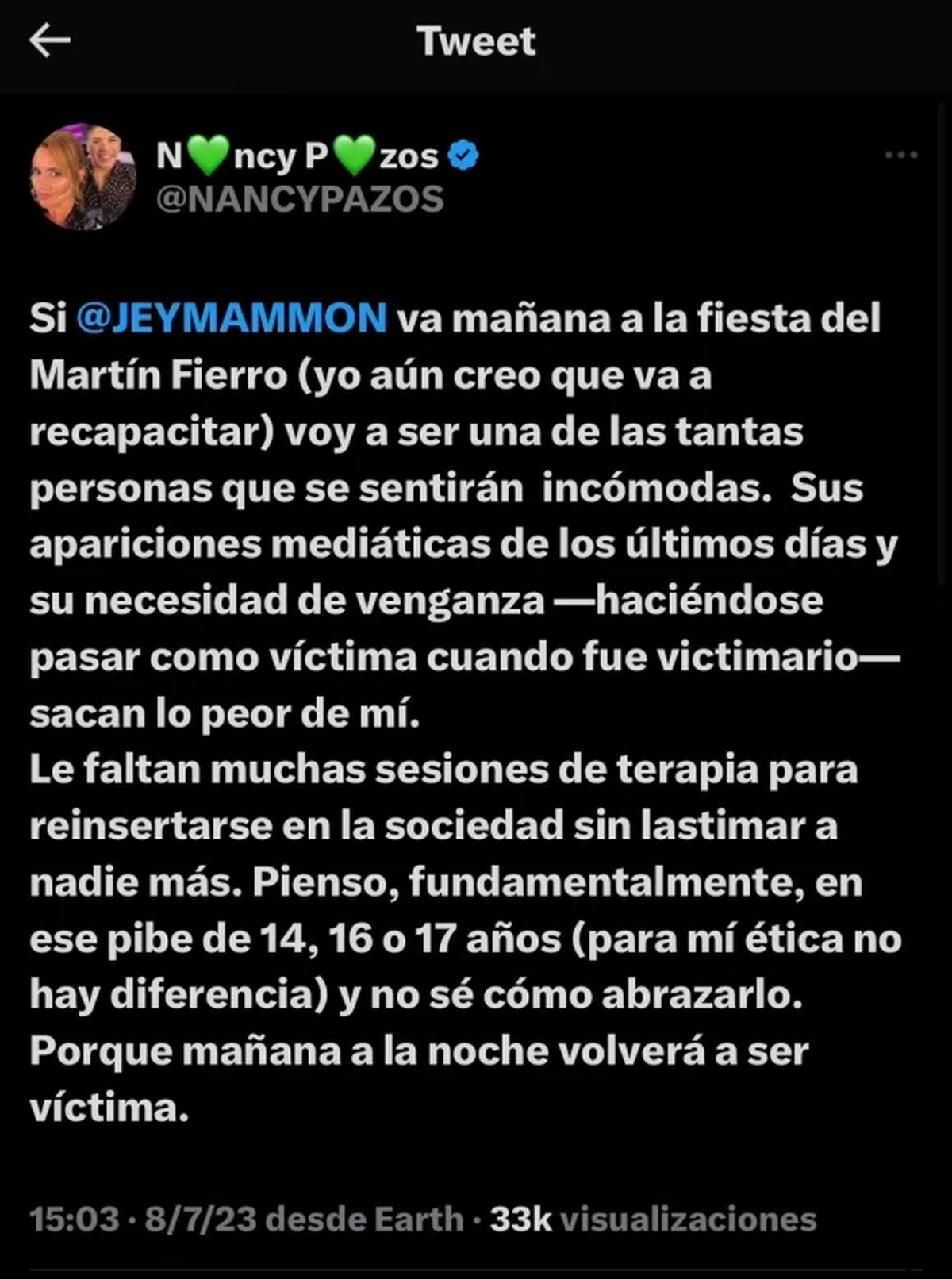 En sus redes sociales, Nancy de esta manera dejó en claro su postura respecto a la aparición pública de Jey, quien afirmó que irá a la entrega premios este domingo: “No sé cómo abrazar a Lucas. Porque mañana a la noche volverá a ser víctima”.