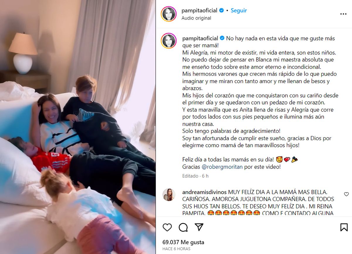 "Solo tengo palabras de agradecimiento! ¡Soy tan afortunada de cumplir este sueño, gracias a Dios por elegirme como mamá de tan maravillosos hijos! ¡Feliz día a todas las mamás en su día!", cerró Pampita muy emotiva.