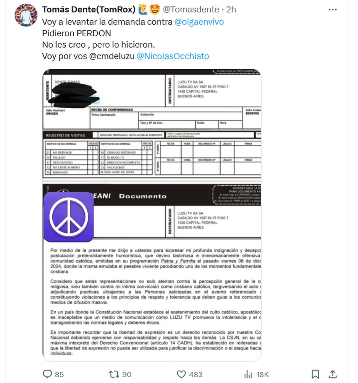 Días atrás, tanto en el programa Mi primo es así, de Olga, como en Patria y Familia, de Luzu, habían recreado un polémico pesebre que indignó a Dente. Es por eso que el periodista, a través de su cuenta de X, exigió a los canales que pidan perdón y publicó imágenes con los documentos de la denuncia.