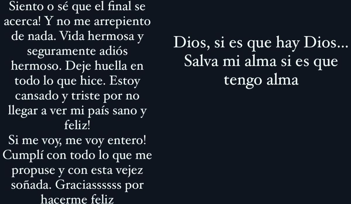 Luego, en otro posteo, sumó: “Dios, si es que hay Dios... Salva mi alma, si es que tengo alma”, alertando aún más a sus seguidores que llenaron la publicación de mensajes de ánimo.