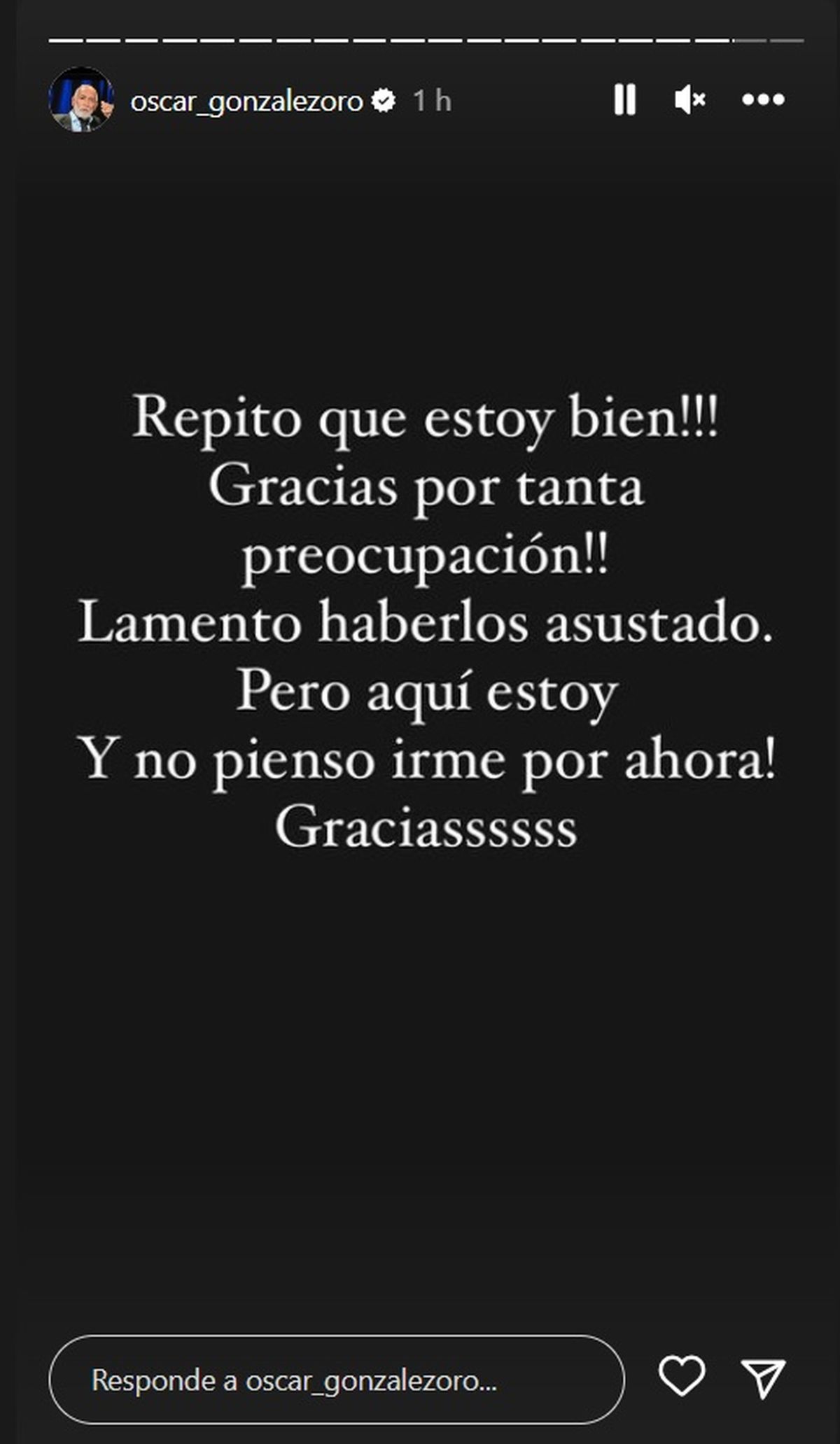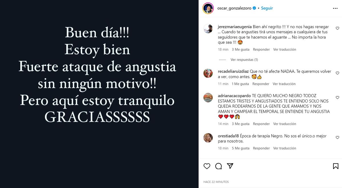 Al otro día, ya más tranquilo, el Negro Oro publicó un nuevo mensaje y contó qué le pasó, llevando tranquilidad a todos: "Buen día!!! Estoy bien. Fuerte ataque de angustia sin ningún motivo! Pero aquí estoy tranquilo. Gracias".