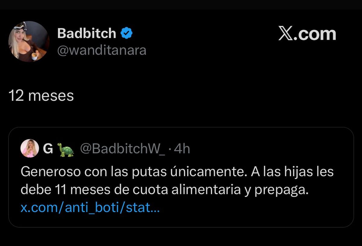 Wanda Nara, lejos de ignorarlo, lo replicó en su propia cuenta y agregó con contundencia: “12 meses”, remarcando la deuda que mantiene el futbolista con su ex por sus hijas y que los tiene enfrentados hace meses en la Justicia.