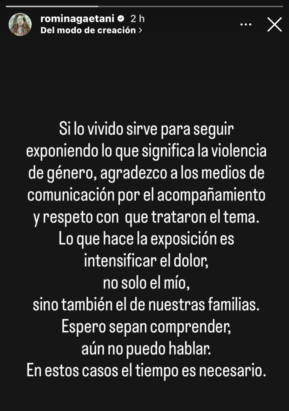 En ese mismo mensaje, la actriz pidió comprensión y explicó por qué decidió no brindar declaraciones por el momento: “Espero sepan comprender, aún no puedo hablar. En estos casos el tiempo es necesario”, señaló, remarcando la necesidad de transitar el proceso con resguardo y cuidado.