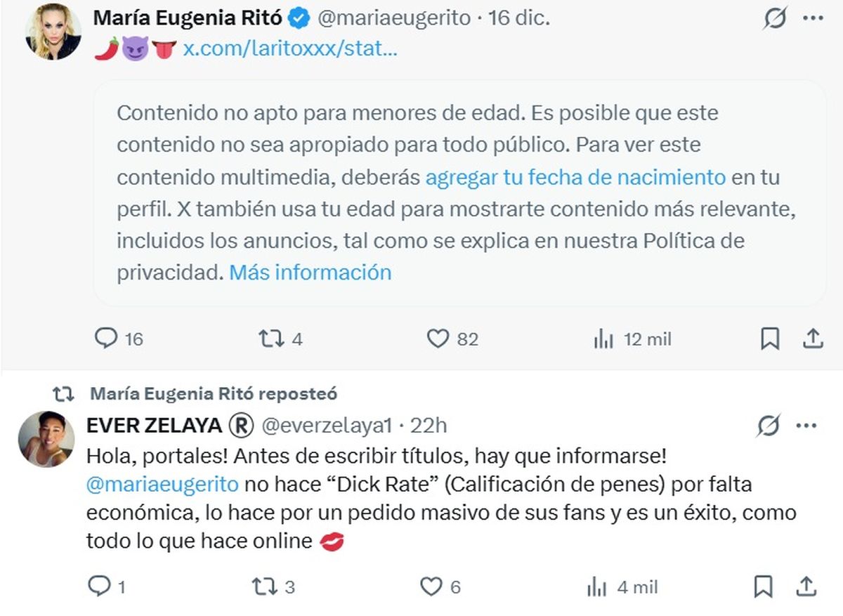 "¡Hola, portales! Antes de escribir títulos, hay que informarse! @mariaeugerito no hace “Dick Rate” (calificación de penes) por falta económica, lo hace por un pedido masivo de sus fans y es un éxito, como todo lo que hace online", indicó Ever en un mensaje que fue reposteado por la propia María Eugenia Ritó, dejando en claro que no se trata de una acción para generar dinero sino de un pedido de sus fanáticos ante el éxito que tiene en la web.