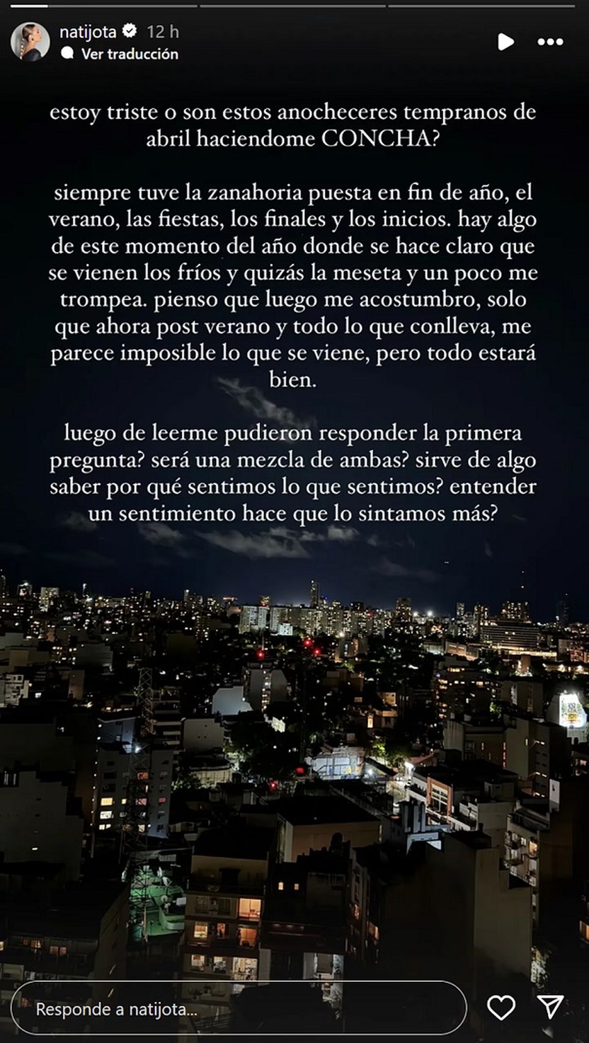“¿Estoy triste o son estos anocheceres tempranos de abril haciéndome concha? Siempre tuve la zanahoria puesta en fin de año, el verano, las fiestas, los finales y los inicios. Hay algo de este momento del año donde se hace claro que se vienen los fríos y tal vez la meseta un poco me trompea”, describió desde sus historias de Instagram la influencer y conductora.