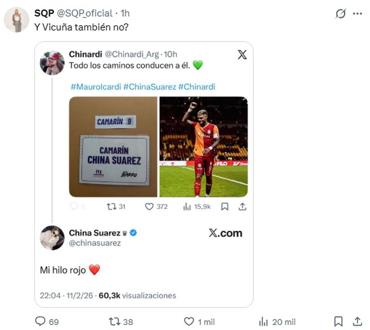 Desde la cuenta oficial de SQP (América TV) no dejaron pasar el detalle y lanzaron una ironía directa: “Y a Vicuña también, ¿no?”. La referencia no fue casual. El hilo rojo es el título de la película en la que la China Suárez y Benjamín Vicuña se conocieron, se enamoraron y comenzaron una relación que estuvo marcada por el recordado escándalo del motorhome cuando Pampita, por entonces pareja del chileno, los encontró teniendo sexo. Además, él es el padre de sus hijos Magnolia y Amancio.