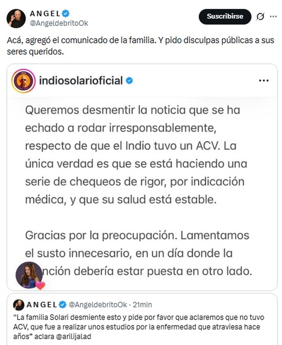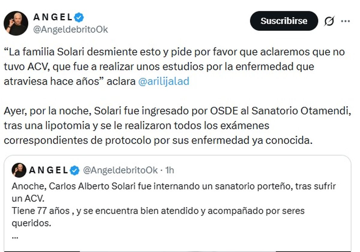 “La familia Solari desmiente esto y pide por favor que aclaremos que no tuvo ACV, que fue a realizar unos estudios por la enfermedad que atraviesa hace años” aclara @arilijalad, informó el periodista en un segundo posteo.