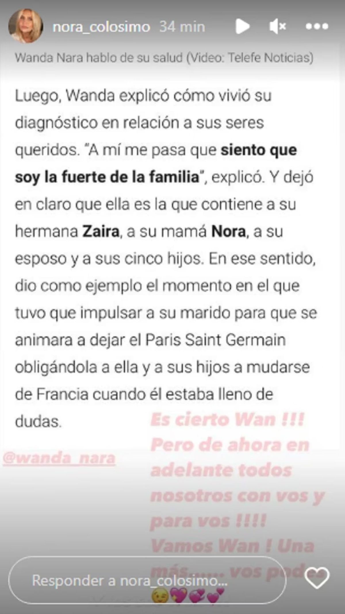 Nora citó una frase de la mediática en Telefe Noticias: "Siento que soy la más fuerte de la familia", y, por su parte, ella remató: "Es cierto Wan! Pero de ahora en adelante, todos nosotros con vos y para vos. Vamos Wanda!! Una más.... vos podes".