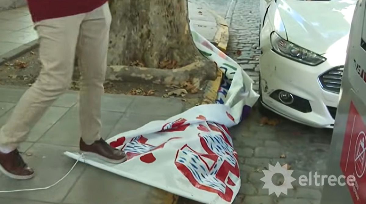 Seguramente con el viento el mismo habrá cedido y ya se encontraba en el asfalto. "Está como Luciano, arrastrado, en el piso, y encima como el amor, pisoteado", dijo el periodista Alan Ferraro, mientras mostraba el estado en que quedó el pasacalles de color blanco y letras de colores.