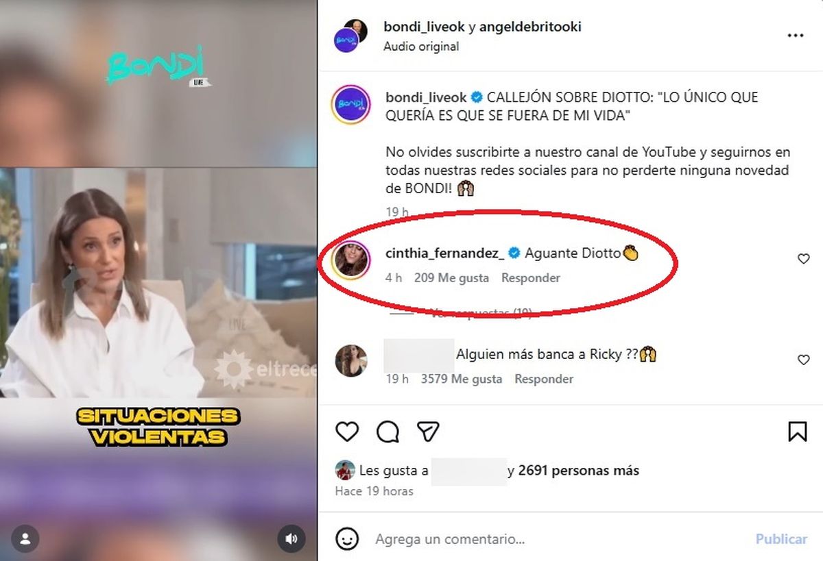 Fue entonces cuando Fernández, fiel a su estilo frontal, dejó un comentario que rápidamente generó repercusión.“Aguante Diotto”, escribió en la publicación, acompañado por emojis de aplausos, dejando explícita su postura en medio del conflicto.