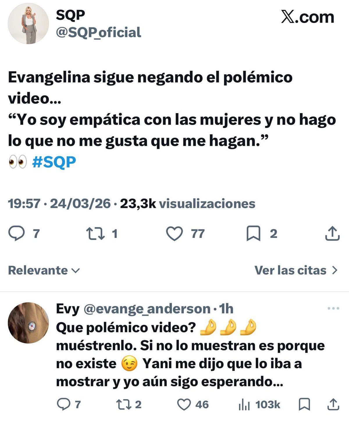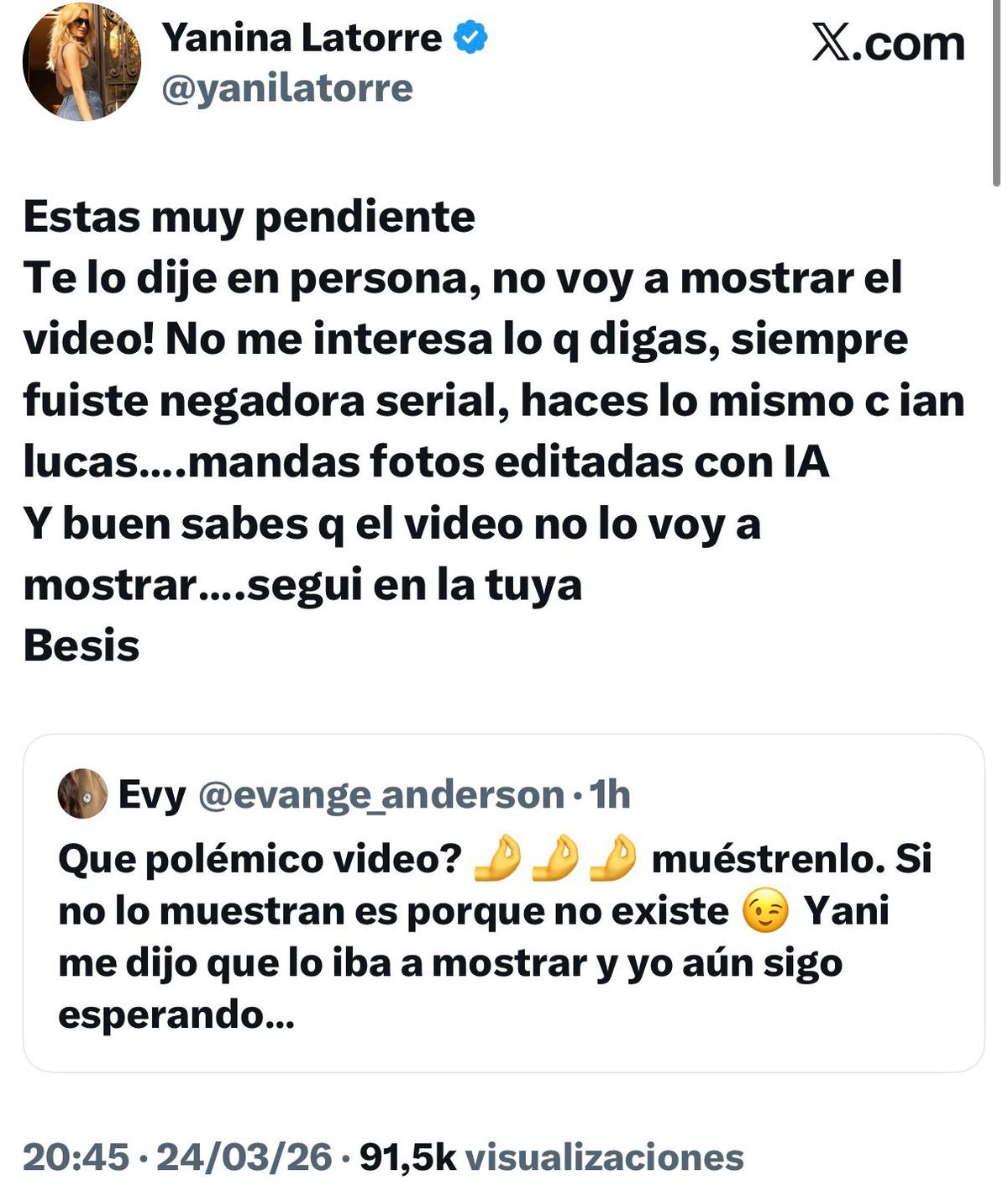 La polémica se reactivó luego de que desde la cuenta de X del programa SQP deslizaran: “Evangelina sigue negando el polémico video…”. Lejos de esquivar el tema, la modelo respondió con un mensaje directo: "¿Qué polémico video? Muéstrenlo. Si no lo muestran es porque no existe. Yani me dijo que lo iba a mostrar y yo aún sigo esperando…".