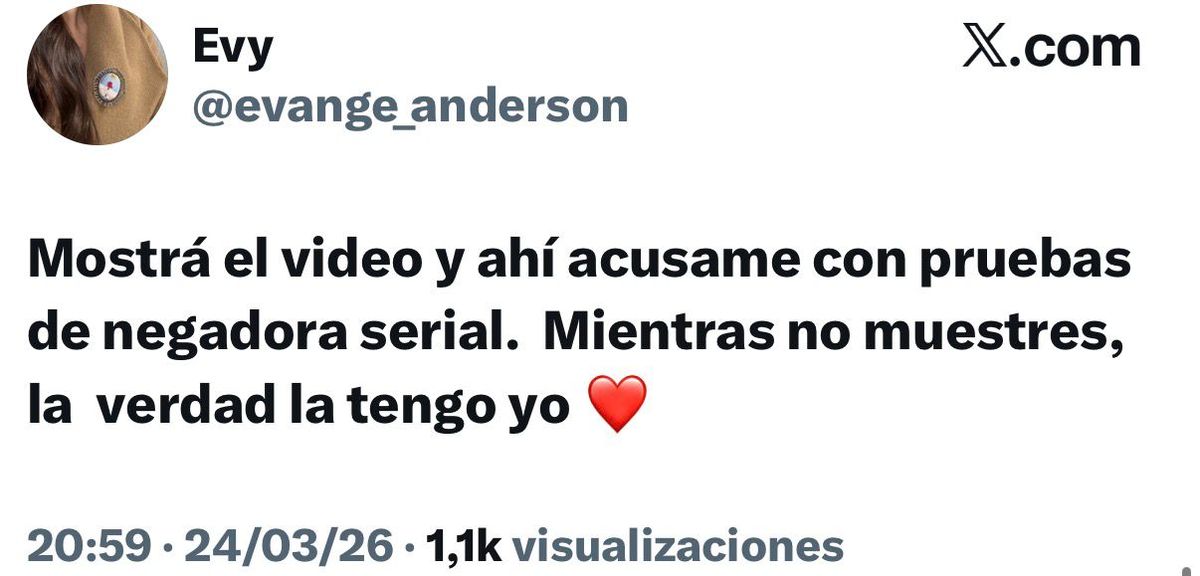 Pero el ida y vuelta no terminó ahí. Evangelina volvió a responder y redobló la presión: "Mostrá el video y ahí acusame con pruebas de negadora serial. Mientras no muestres, la verdad la tengo yo".