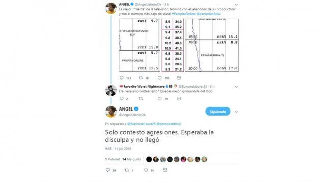 "La mejor "mierda" de la televisión, terminó con el abandono de su "conductora" y con el número más bajo del canal #PampitaOnline@pampitaoficial", comentó filoso Ángel.