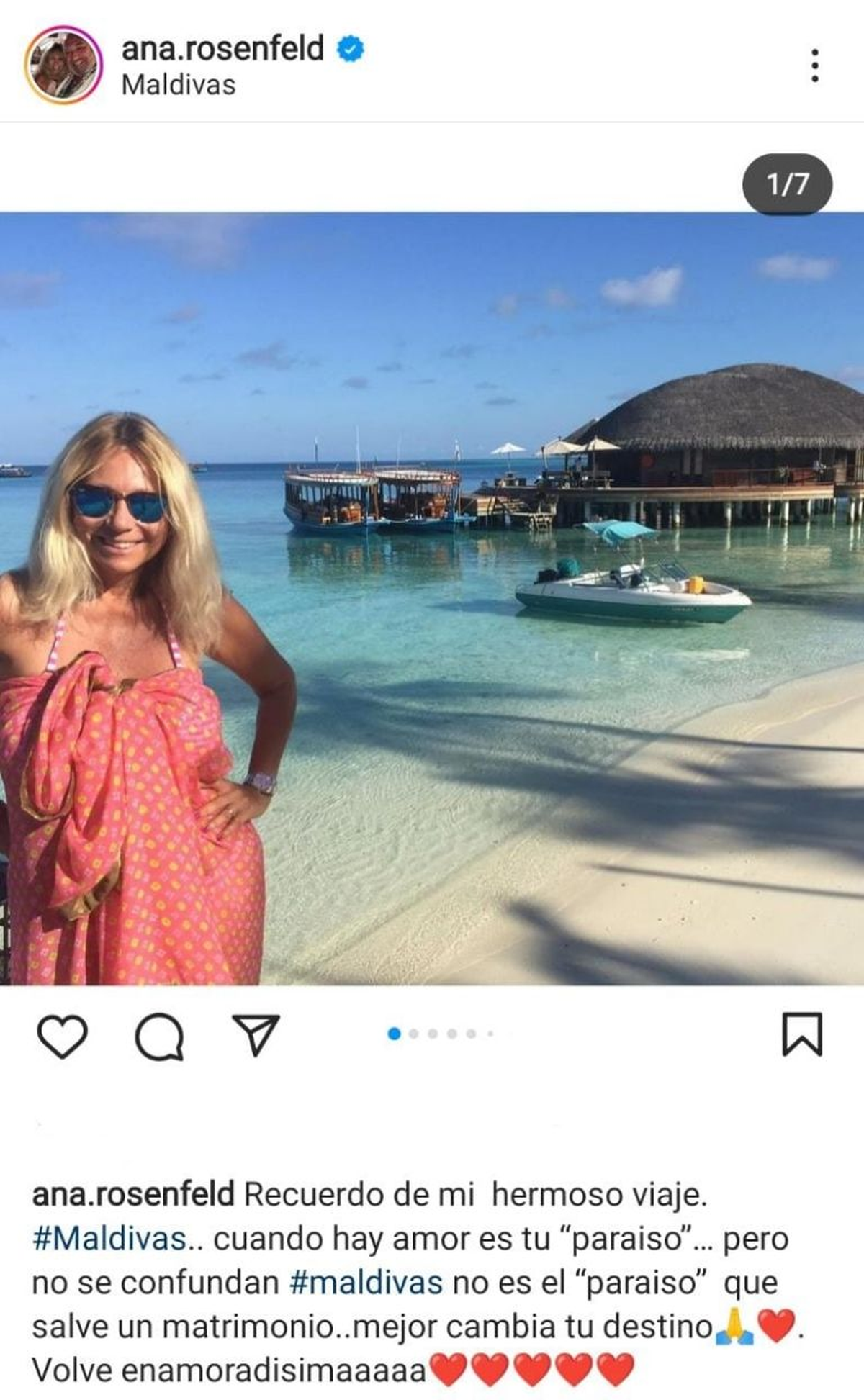 La letrada compartió una foto desde ese lugar y dio una definición que puso en duda la reconciliación: "Recuerdo de mí hermoso viaje a Maldivas. Cuando hay amor es tu paraíso. Pero no sé confundan, Maldivas no es un paraíso que salva un matrimonio. Mejor cambia tu destino... Volvé enamoradisima".