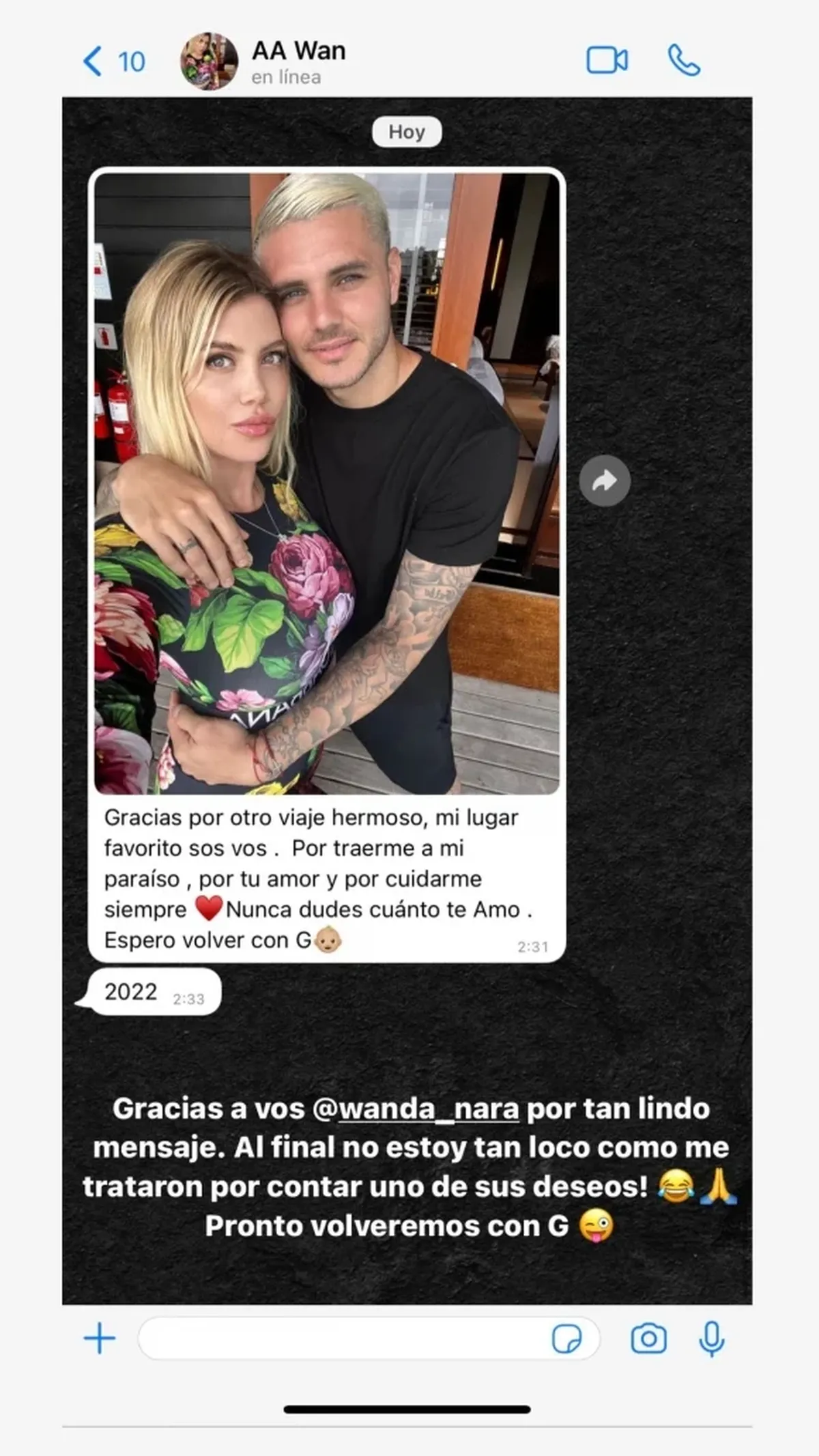 "Gracias por otro viaje hermoso, mi lugar favorito sos vos. Gracias por traerme a mi paraíso, por tu amor y por cuidarme siempre. Nunca dudes cuánto te amo. Espero volver con G (junto al emoji de un bebé)", le dice Wanda a Mauro en dicha conversación.