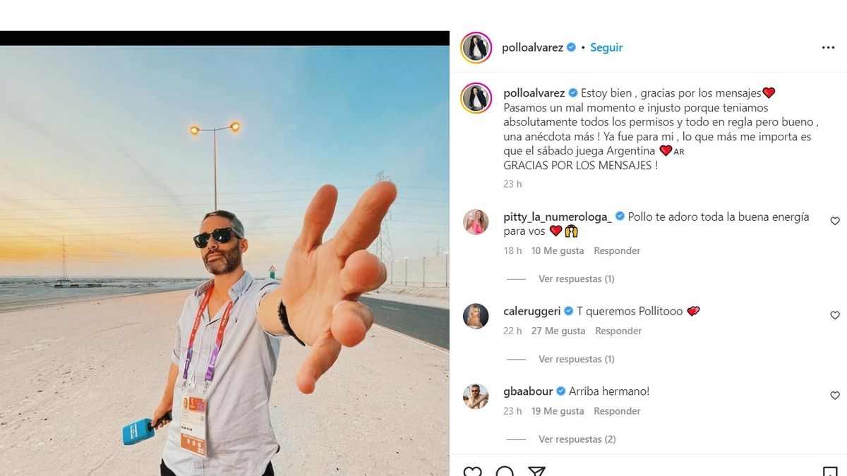 Mientras que en Instagram, tras aquel tenso momento, posteó: "Estoy bien, gracias por los mensajes. Pasamos un mal momento e injusto porque teníamos absolutamente todos los permisos y todo en regla pero bueno, una anécdota más! Ya fue para mi, lo que más me importa es que el sábado juega Argentina. GRACIAS POR LOS MENSAJES!".
