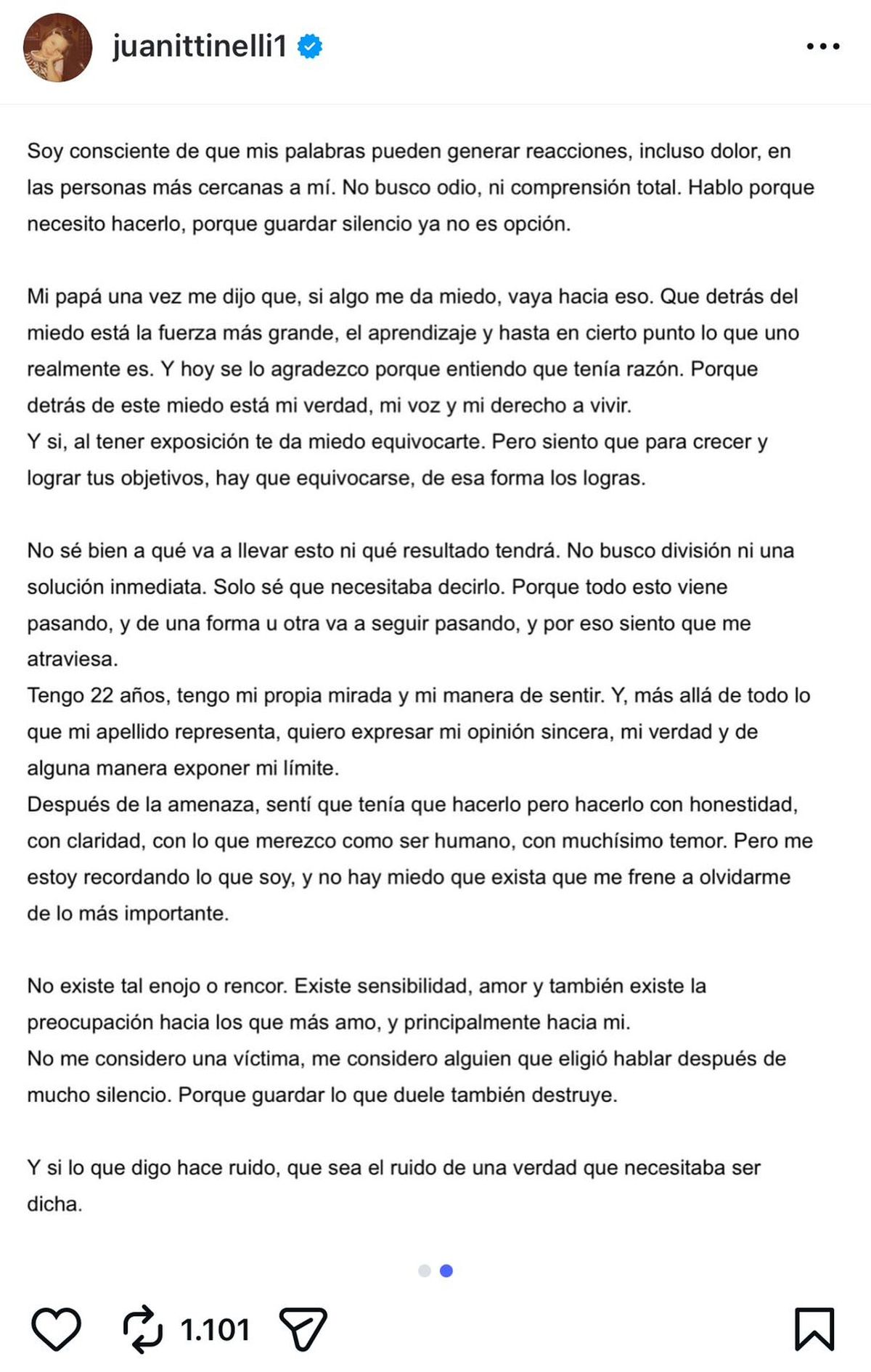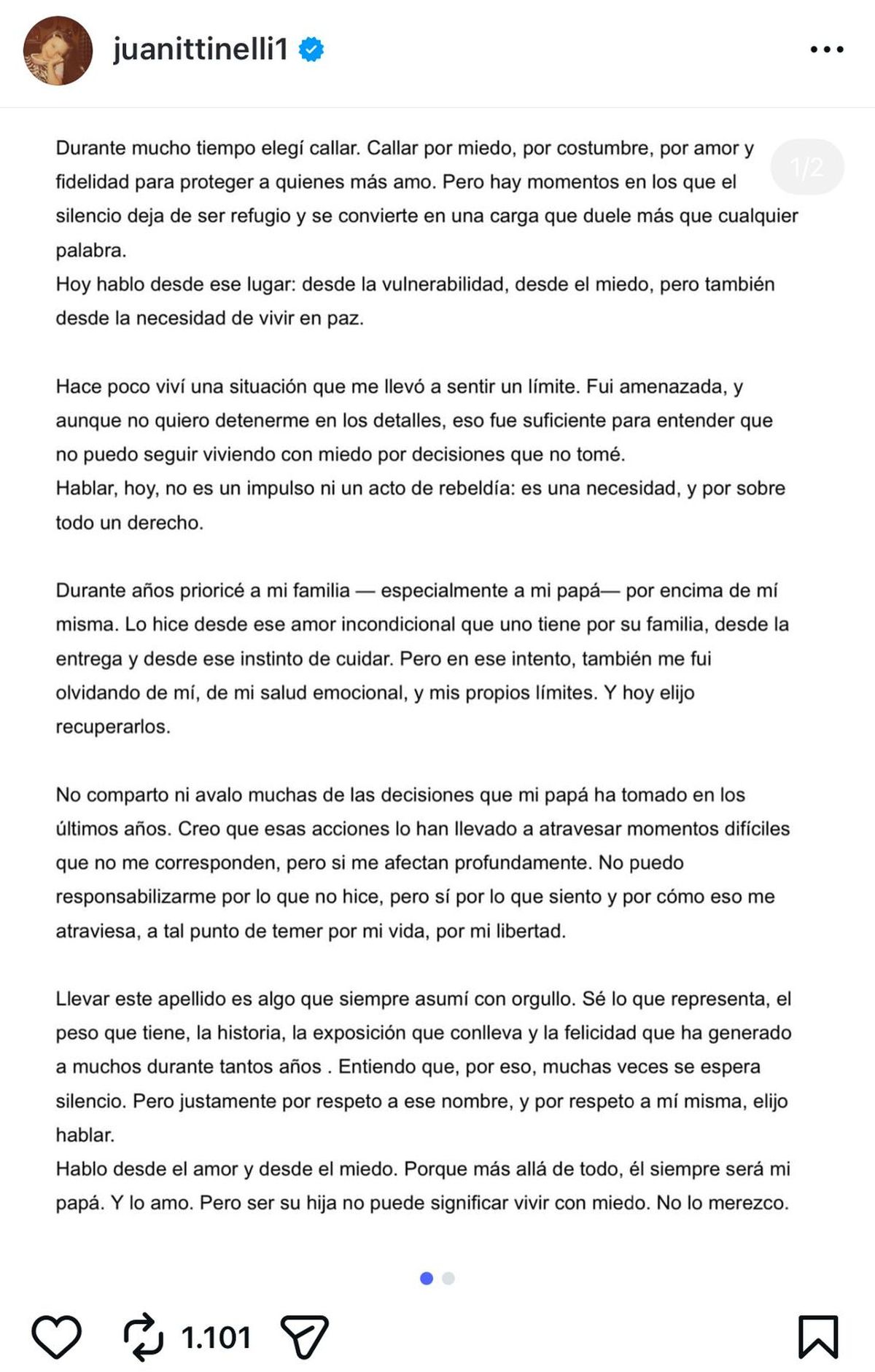 Juanita Tinelli rompió el silencio con una publicación en sus redes sociales, donde expuso que recibió amenazas y habló de la aparente responsabilidad de su papá, Marcelo Tinelli, según revelaron en Secretos Verdaderos (América TV).