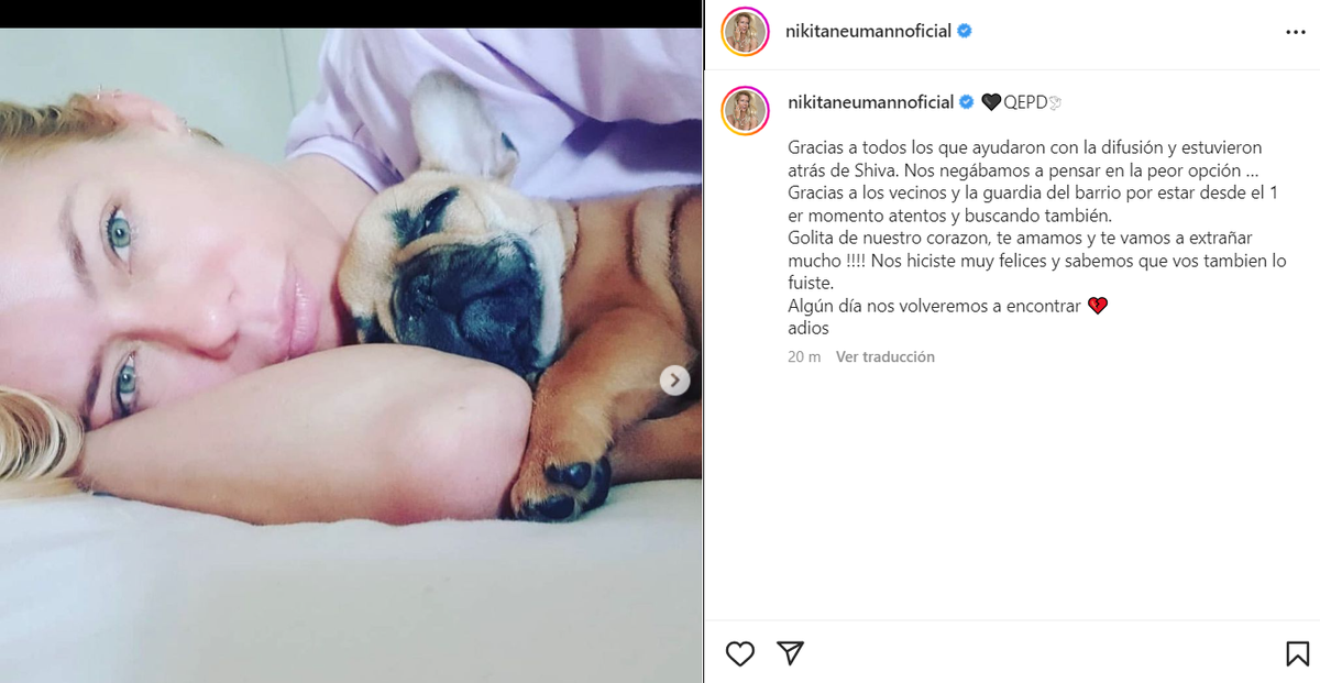 En la noche del miércoles, Nicole Neumann usó sus redes sociales para hacer un doloroso anuncio sobre su perrita Shiva, a la que venía buscando desde el fin de semana.